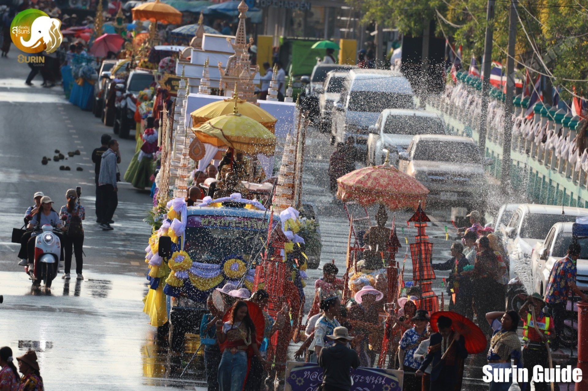 สิ่งที่ทำให้งานนี้แตกต่างจากสงกรานต์ที่อื่น คือ ขบวนช้างแสนสง่างาม ที่เข้าร่วมในพิธีและขบวนแห่ ช้างซึ่งเป็นสัญลักษณ์สำคัญของจังหวัดสุรินทร์ จะถูกประดับตกแต่งอย่างสวยงาม สร้างภาพความยิ่งใหญ่และน่าประทับใจแก่ผู้ร่วมงาน